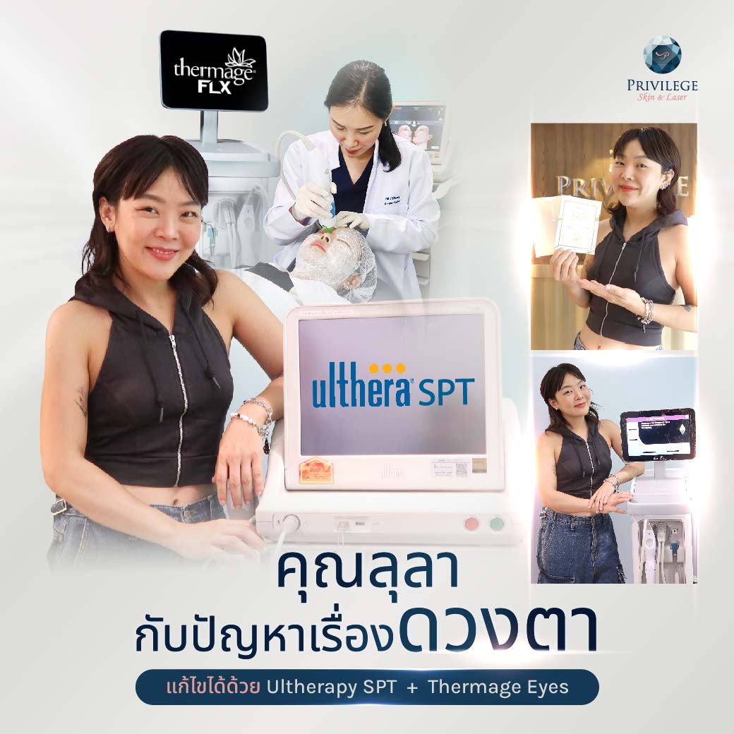 Ultherapy SPT รอบดวงตา จะมาช่วยในการยกกระชับ โดยจะช่วยกระตุ้นในชั้น SMAS ให้กระชับ ให้คิ้วยกขึ้น โดยไม่เปลี่ยนทรงคิ้วที่เป็นอยู่ ตาเราก็จะดูโตชัดขึ้น เทคนิคพิเศษเฉพาะที่ PRIVILEGE Clinic เมื่อทำควบคู่กับ Thermage Eyes จะทำให้ดวงตาดูสดใสขึ้น ตาไม่เหี่ยว ชั้นตาสวย ทำให้ใบหน้าโดยรวมดูเด็กกว่าวัย และสดใสมากยิ่งขึ้น ถึงหน้าเด็กแต่ตาเหี่ยวยังไงก็ดูแก่ รีบมาป้องกันการเกิดริ้วรอยแต่เนิ่นๆ จะดีกว่า