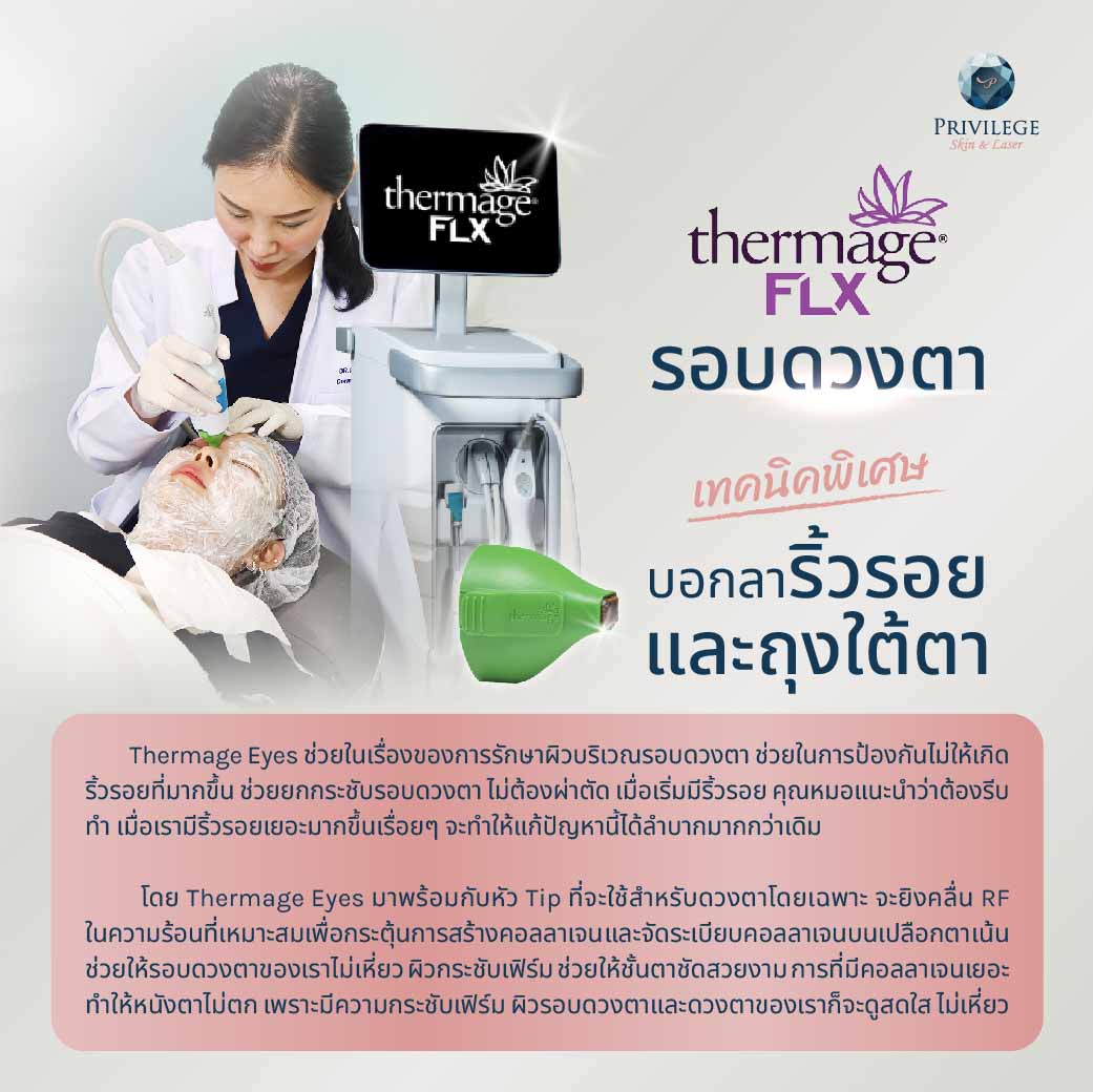 ตัว Thermage Eyes จะช่วยในเรื่องของการรักษาผิวบริเวณรอบดวงตา ช่วยในการป้องกันไม่ให้เกิดริ้วรอยที่มากขึ้น Thermage รอบดวงตา ยกกระชับรอบดวงตา ไม่ต้องผ่าตัด เมื่อเริ่มมีริ้วรอย คุณหมอแนะนำว่าต้องรีบมาทำเลย เมื่อเรามีริ้วรอยเยอะมากขึ้นเรื่อยๆ จะทำให้แก้ปัญหานี้ได้ลำบากมากกว่าเดิม โดย Thermage Eyes มาพร้อมกับหัว Tip ที่จะใช้สำหรับดวงตาโดยเฉพาะ จะยิงคลื่น RF ในความร้อนที่เหมาะสมเพื่อกระตุ้นการสร้างคอลลาเจน และจัดระเบียบคอลลาเจนบนเปลือกตา เน้นช่วยให้รอบดวงตาของเราไม่เหี่ยว ผิวกระชับเฟิร์ม แล้วก็ช่วยให้ชั้นตาชัดสวยงาม การที่มีคอลลาเจนเยอะ ทำให้หนังตาไม่ตก เพราะมีความกระชับเฟิร์ม ผิวรอบดวงตาและดวงตาของเราก็จะดูสดใส ไม่เหี่ยว