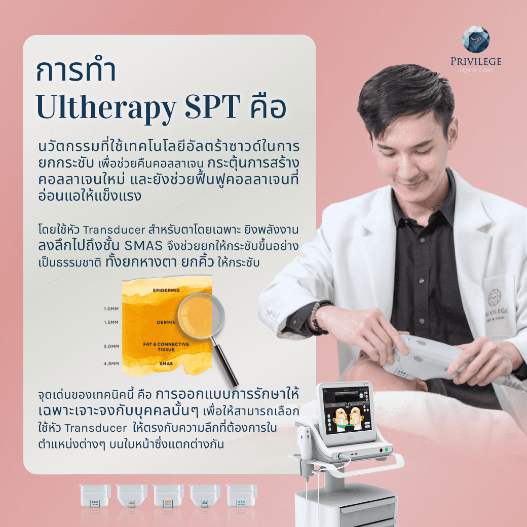 การทำ Ultherapy SPT คือ นวัตกรรมที่ใช้เทคโนโลยีอัลตร้าซาวด์ในการยกกระชับ เพื่อช่วยคืนคอลลาเจน กระตุ้นการสร้างคอลลาเจนใหม่ และยังช่วยฟื้นฟูคอลลาเจนที่อ่อนแอให้แข็งแรง โดยใช้หัว Transducer สำหรับตาโดยเฉพาะ โดยยิงพลังงานลงลึกไปถึงชั้น SMAS จึงช่วยยกให้กระชับขึ้น ยกอย่างเป็นธรรมชาติ ทั้งยกหางตา ยกคิ้ว ให้กระชับ จุดเด่นของเทคนิคนี้ คือ การออกแบบการรักษาให้เฉพาะเจาะจงกับบุคคลนั้นๆ เพื่อให้สามารถเลือกใช้หัว Transducer ให้ตรงกับความลึกที่ต้องการในตำแหน่งต่างๆบนใบหน้าซึ่งแตกต่างกัน