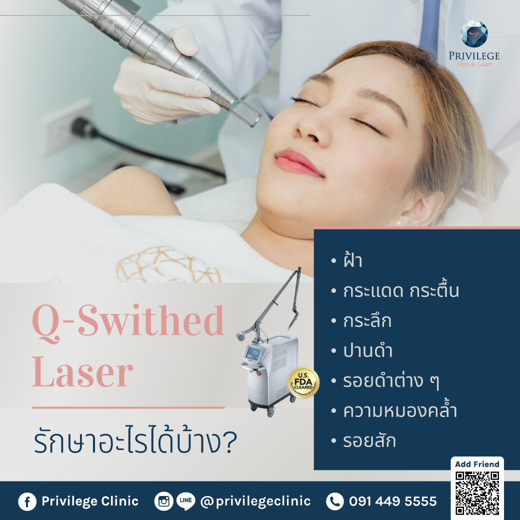เป็นเครื่องเลเซอร์ ที่จำเพาะเจาะจงสำหรับการรักษาในเรื่องของเม็ดสีต่างๆ ไม่ว่าจะเป็นเม็ดสีดำที่เกิดจากเมลานิน หรือ การลบเม็ดสีที่เกิดจากรอยสักต่างๆ ซึ่งจะช่วยลดรอยหมองคล้ำ ทำให้ผิวสว่างขึ้น สีผิวสม่ำเสมอขึ้น เมื่อมีการทำอย่างต่อเนื่อง นอกจากนี้ นอกจากนี้ Q-switched ยังได้รับการรับรองโดยองค์การอาหารและยาสหรัฐอเมริกาว่าช่วยลดริ้วรอยตื้นๆ และทำให้ผิวเรียบเนียนขึ้นได้ เนื่องจากความร้อนที่เกิดขึ้นช่วยกระตุ้นการสร้างคอลลาเจนใต้ผิวหนัง จึงช่วยในการชะลอวัยได้เป็นอย่างดี